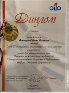 В очном заключительном туре олимпиады студент 3-го курса направления подготовки «Бизнес-информатика» Ахметзянов Наиль Ринатович завоевал золотую медаль по дисциплине «Информатика» (профиль «Экономика и управление»).