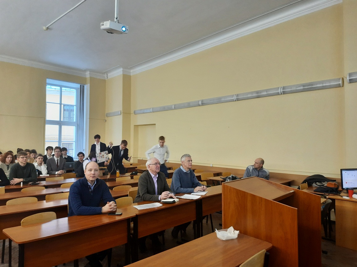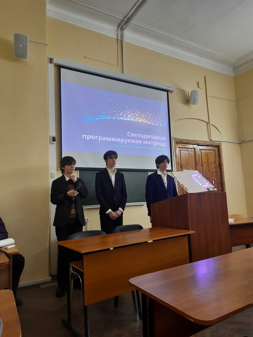 Дисциплина «Инженерные аспекты информационного общества» предполагает формирование у студентов компетенций в области физики, необходимых им как основы для подготовки ИТ-специалиста. В этом учебном году по предложению ассистента Бодрова К.Ю. на практических занятиях студентам групп ИС-2301 и 02 было предложено реализовать проект (технический или программный), который бы демонстрировал один из физических законов. Студенты творчески подошли к решению поставленной задачи и создали интересные проекты. В каждой группе было отобрано по четыре лучших проекта, которые были представлены авторами на общем собрании двух групп. Проекты оценивало жюри, состоявшее из декана факультета Д.С. Юдина и преподавателей кафедры И.Л. Коршунова, А.А. Емельянова, С.И. Топталова, И.В. Левоевой.