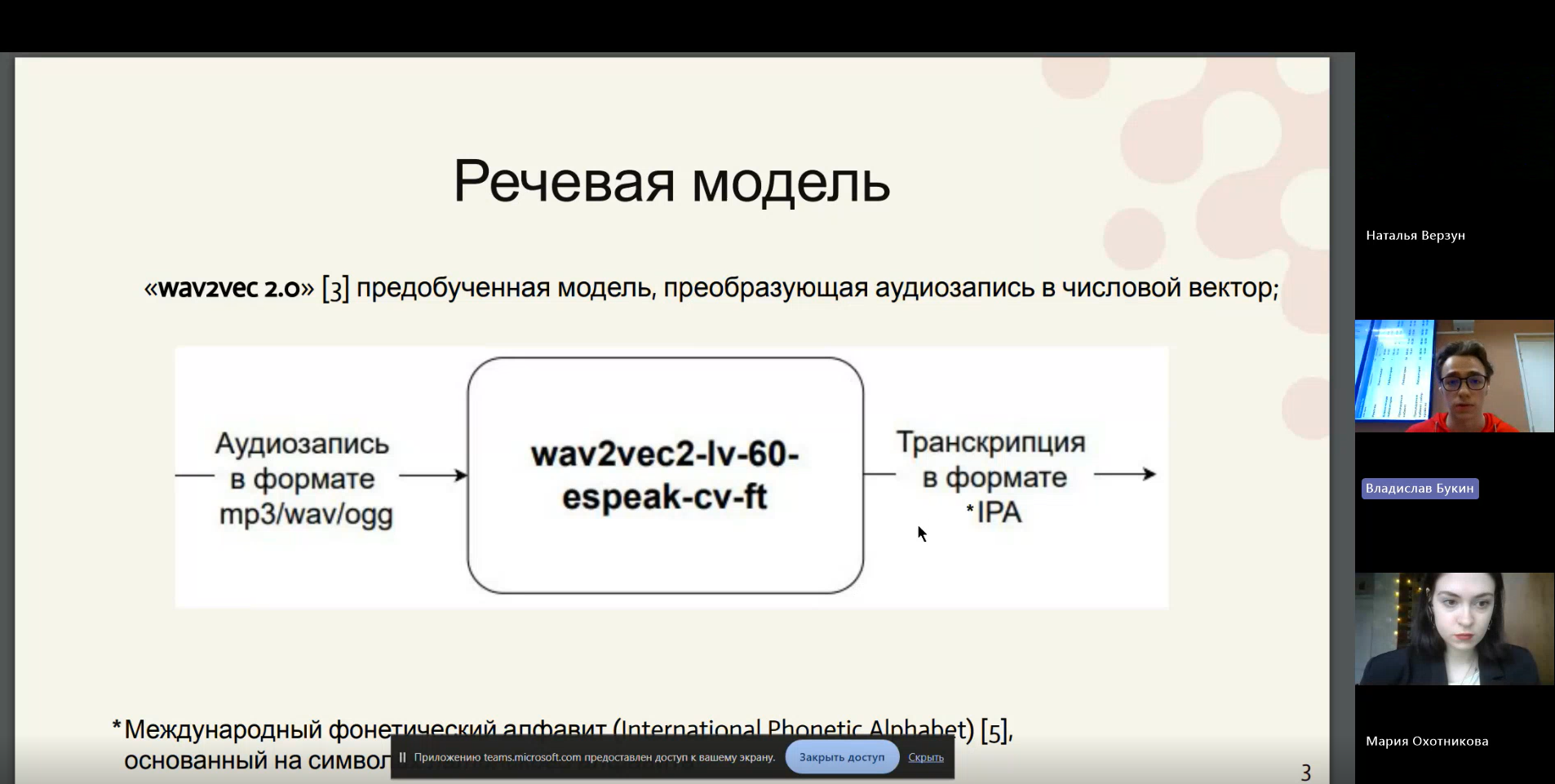 - Букина В.С. (гр. БИ-2202) на тему: «Использование модели автоматического фонетического разбора для оценки произношения пациентов с дефектами речи» (Н.р. – канд. техн. наук, доц. Никифоров С.Г.).
