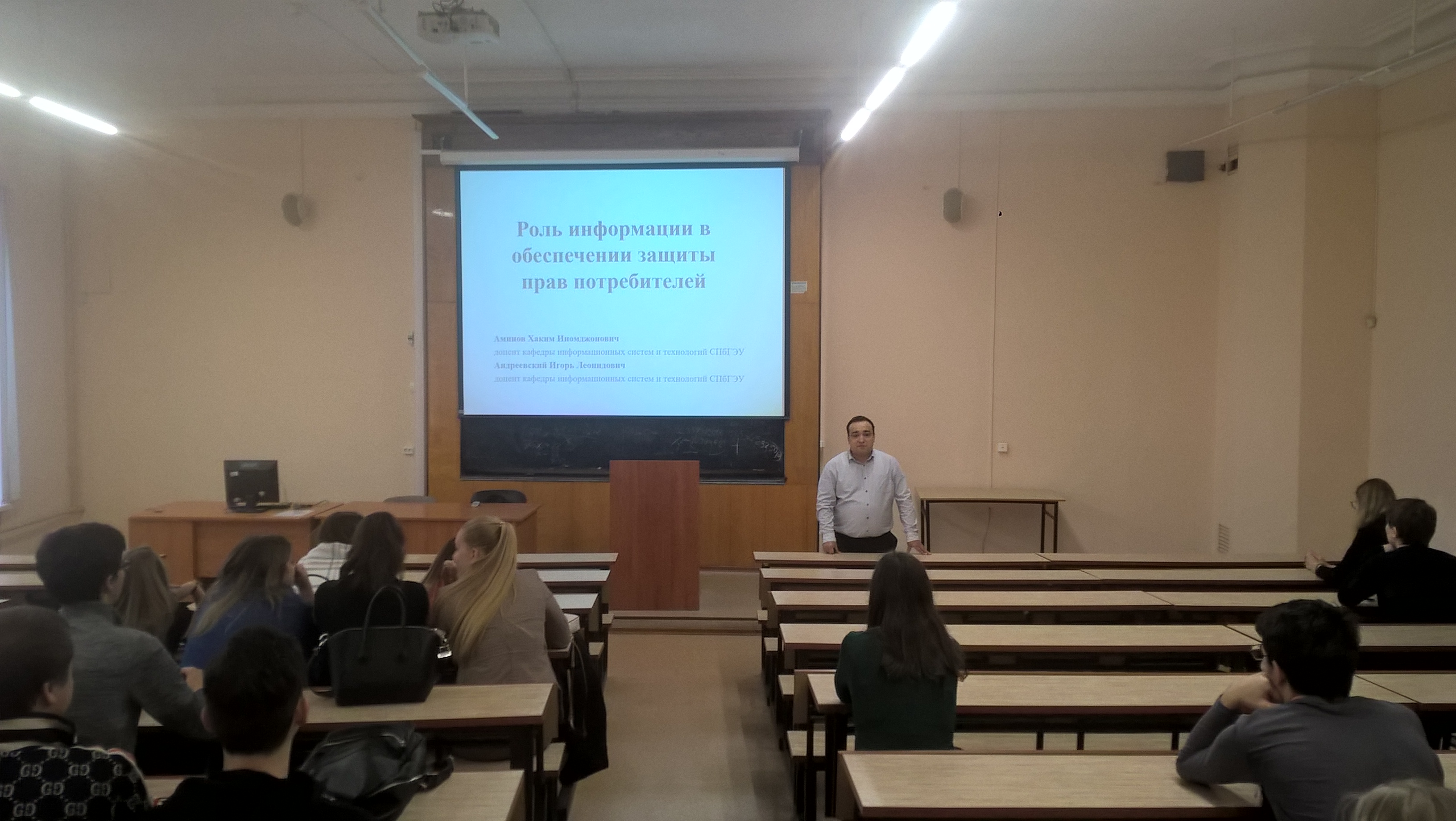 27 сентября 2019 г. в рамках молодежного дня Международной научно-практической конференции «Национальная концепция качества: государственная и общественная защита прав потребителей» преподавателями кафедры информационных систем и технологий, доцентами Аминовым Х.И. и Андреевским И.Л., был проведен мастер-класс для студентов направлений подготовки «Бизнес-информатика» и «Управление качеством» на тему: «Роль информации в обеспечении прав потребителей».